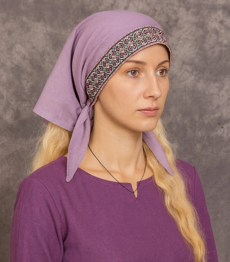 Linen triangular scarf with geometric trim in Slavic-rustic style