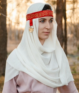 Hand-embroidered natural silk Slavic headband with bronze temple rings
