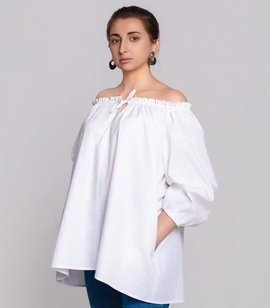 Off-shoulder natural linen blouse with drawstring neckline and hidden pockets