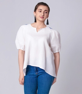 Natural linen asymmetrical blouse with short puff sleeves and embroidered shoulders
