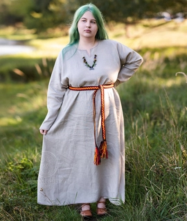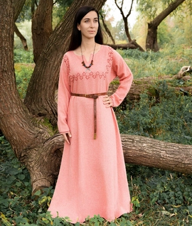 Early Medieval linen dress with hand-embroidered round neckline