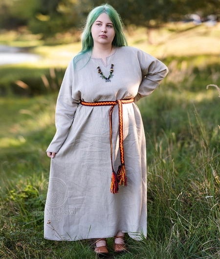 Basic early medieval linen dress with a slit V-neckline