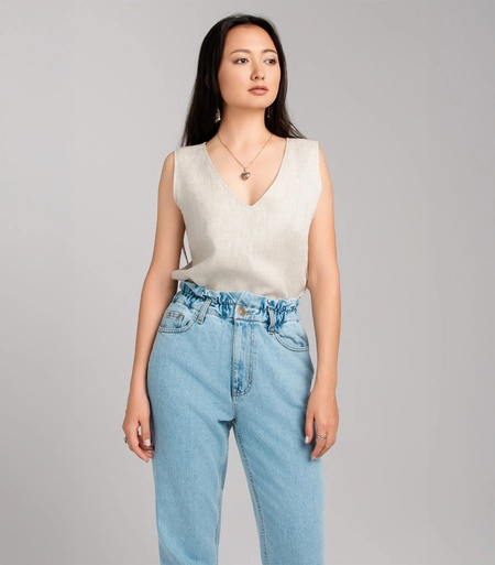 Prosty lniany top bez rękawów z dekoltem w serek