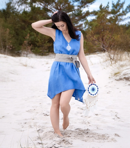 Lniana tunika asymetryczna bez rękawów z haftem słowiańskim bogini Mokosz
