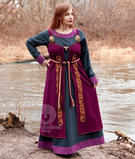Wczesnośredniowieczna szeroka wełniana suknia ozdobiona wełnianymi obszyciami w kratkę