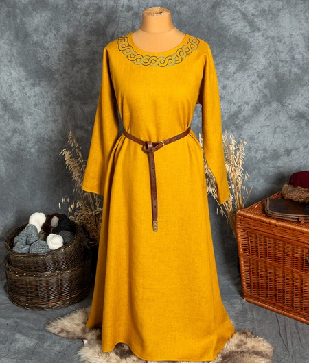 Wczesnośredniowieczna lniana sukienka z ręcznie haftowanym okrągłym dekoltem